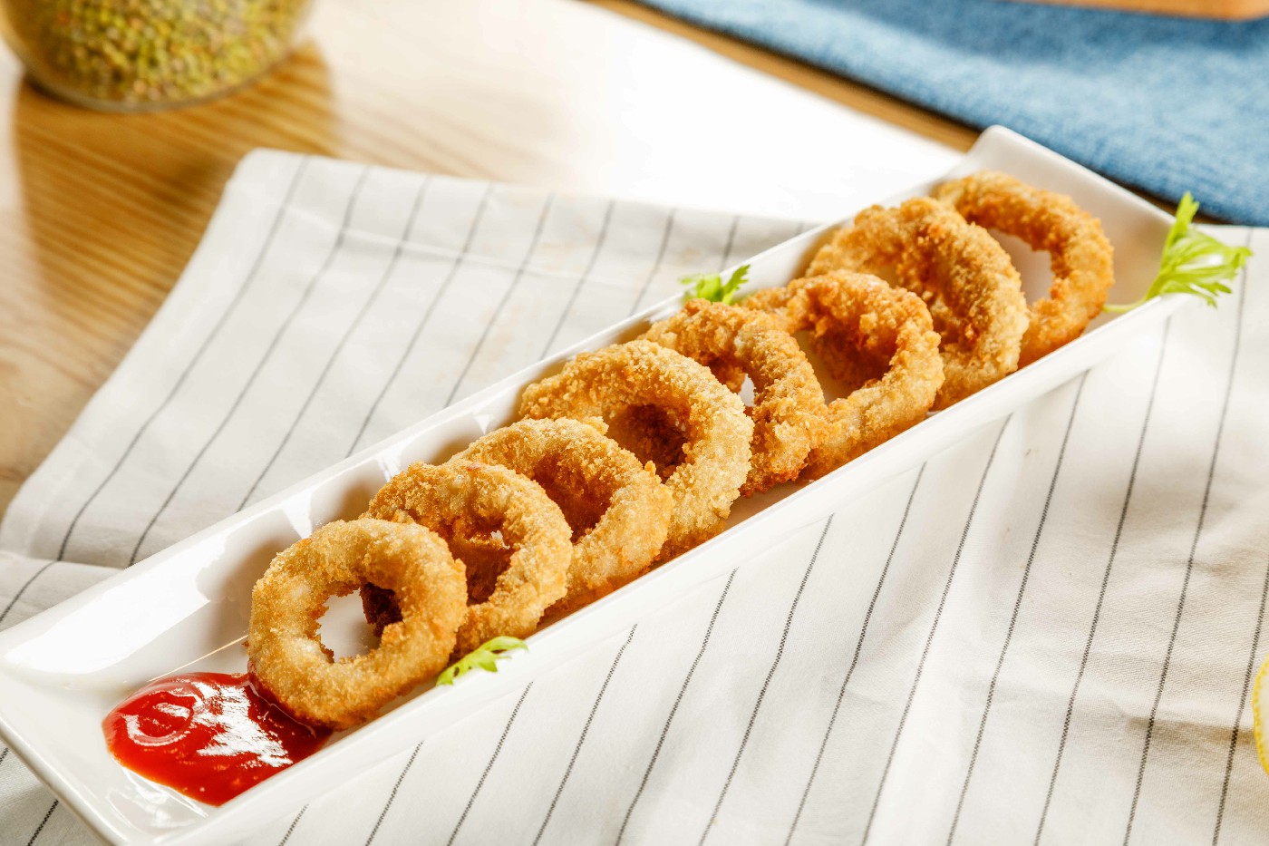 采用帶魚糜及魷魚制成軟嫩Q彈的魷魚圈 經(jīng)油炸后酥脆鮮香 搭配各種醬汁口味更佳