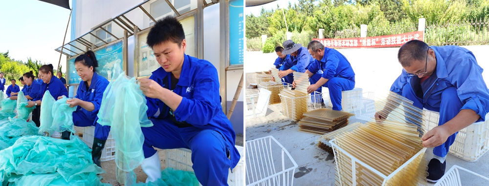 蝦夷扇貝在苗種繁育和稚貝養(yǎng)殖過程中,苗種出庫和分苗階段離不開大量的網(wǎng)袋。把單個網(wǎng)袋一層層套在一起,20個為一組的套網(wǎng)袋比賽,看似簡單重復(fù),卻是手速和專注力的比拼。只有套的快、查的準,一絲不茍,張弛有度,套出來的網(wǎng)袋才能為幼苗提供更優(yōu)良的養(yǎng)殖環(huán)境。