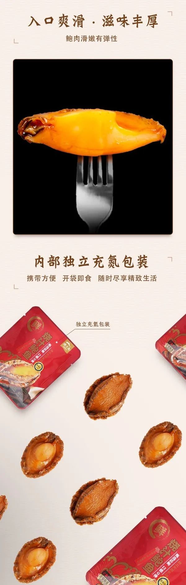 燒汁鮑魚采用獨立小包裝,更符合現(xiàn)代人的飲食習慣,口袋里的小零食,揣兜里隨時開吃。