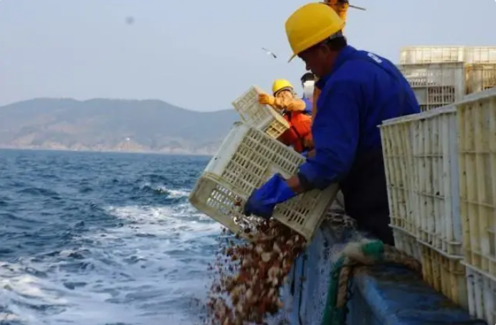獐子島漁業(yè)工人向海洋牧場播撒蝦夷扇貝幼苗,蝦夷扇貝為低溫高鹽種類