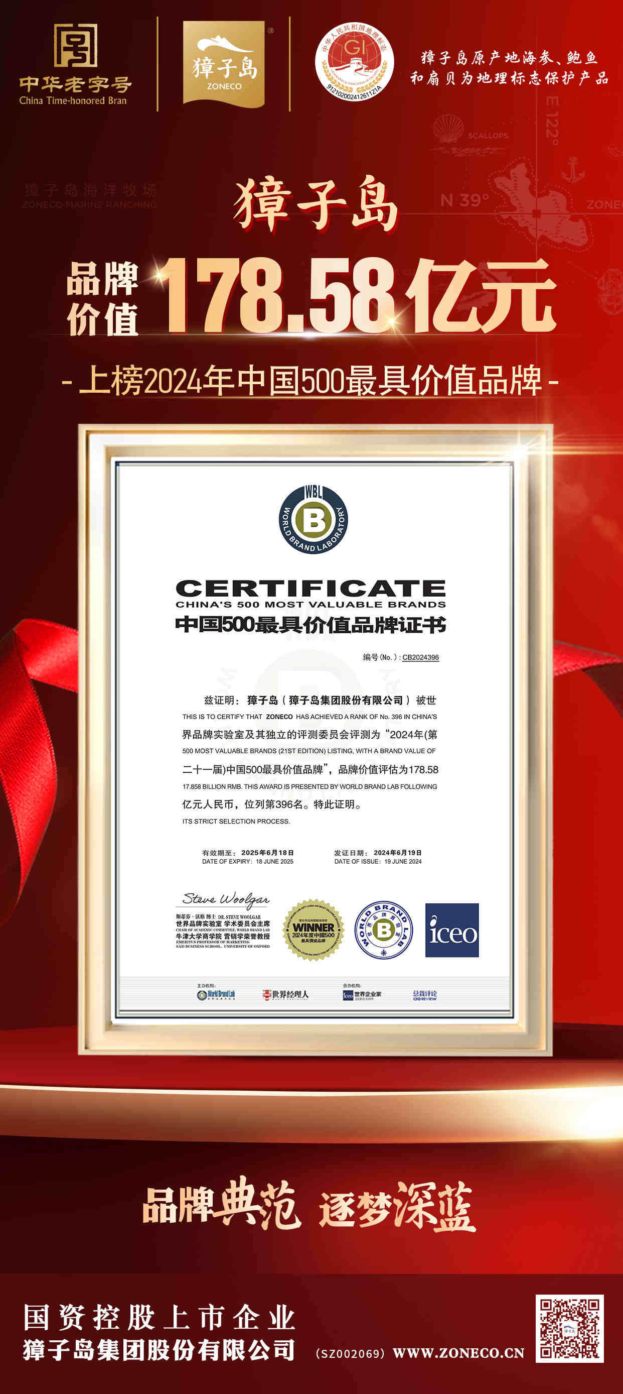 Lab)主辦的(第二十一屆)“世界品牌大會(huì)”在北京隆重舉行,會(huì)上發(fā)布了2024《中國500最具價(jià)值品牌》分析報(bào)告。在這份基于財(cái)務(wù)數(shù)據(jù)、品牌強(qiáng)度和消費(fèi)者行為分析的年度報(bào)告中,獐子島品牌以178.58億元的品牌價(jià)值榮登本年度《中國500最具價(jià)值品牌》榜單,排名396位,展現(xiàn)了強(qiáng)勁的品牌實(shí)力,成為中國海洋食品和海參行業(yè)第一價(jià)值品牌。獐子島集團(tuán)股份有限公司總裁戰(zhàn)成敏應(yīng)邀出席大會(huì),副總裁劉明代表公司上臺(tái)領(lǐng)獎(jiǎng)。