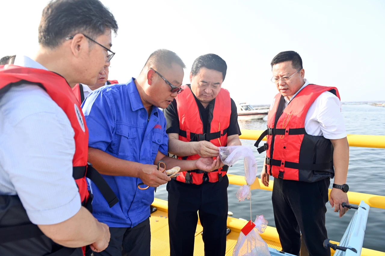 圖片▲省委書記、省人大常委會主任郝鵬來到大連壹鮮冷水海產(chǎn)品有限公司海產(chǎn)品養(yǎng)殖海域,考察海洋牧場建設(shè)情況。