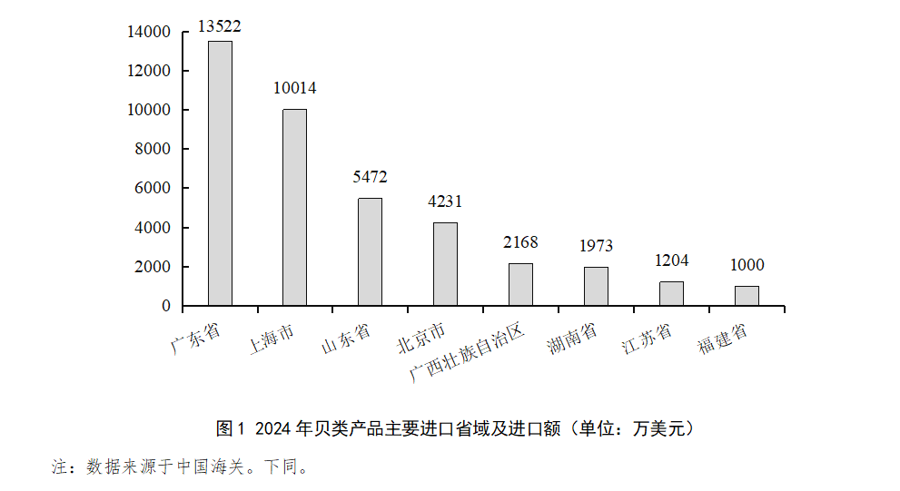 2024年,我國貝類產(chǎn)品主要進(jìn)口省域?yàn)閺V東省、上海市、山東省、北京市、廣西壯族自治區(qū)、湖南省、江蘇省與福建省,分別占進(jìn)口總額的24.45%、18.11%、9.90%、7.65%、3.92%、3.57%、2.18%和1.81%,合計(jì)占71.59%。