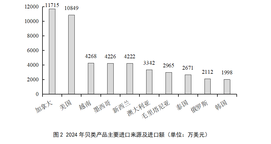 2024年,我國貝類產(chǎn)品前十大進(jìn)口來源國依次為加拿大、美國、越南、墨西哥、新西蘭、澳大利亞、毛里塔尼亞、泰國、俄羅斯聯(lián)邦、韓國,分別占進(jìn)口總額的21.19%、19.62%、7.72%、7.64%、7.64%、6.04%、5.36%、4.83%、3.82%和3.61%,合計(jì)占87.47%。