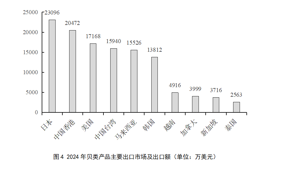 2024年,我國貝類出口前十大市場依次為日本、中國香港、美國、中國臺灣、馬來西亞、韓國、越南、加拿大、新加坡、泰國,分別占出口總額的18.05%、16.00%、13.42%、12.46%、12.14%、10.80%、3.84%、3.13%、2.90%與2.00%,合計(jì)占94.73%。