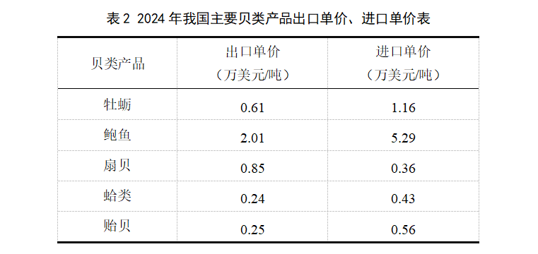 其中,鮑魚、扇貝與牡蠣進(jìn)口量額均大幅減少,蛤類與貽貝進(jìn)口量額則大幅增加;鮑魚的進(jìn)出口單價(jià)均遠(yuǎn)超其他產(chǎn)品,扇貝的出口單價(jià)大于進(jìn)口單價(jià),牡蠣、鮑魚、蛤類和貽貝的進(jìn)口單價(jià)大于出口單價(jià)(見表2)。