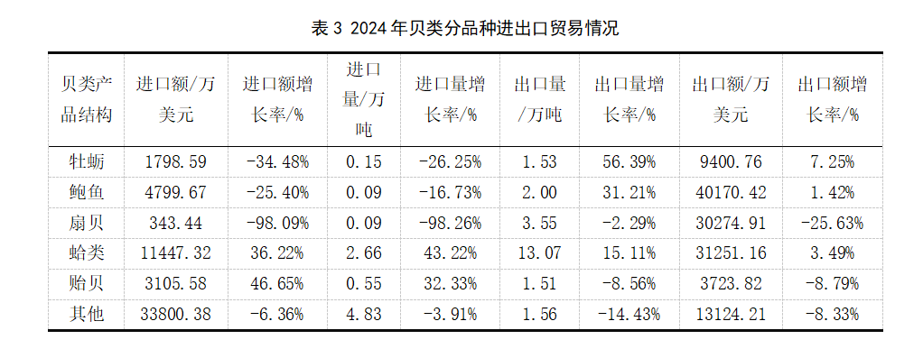 2024年,受部分主要品種及主要進(jìn)出口市場波動影響,我國貝類產(chǎn)品進(jìn)口貿(mào)易量額與出口貿(mào)易額均下降明顯,但直接得益于進(jìn)口下降幅度更大的因素,貝類在保持順差勢頭基礎(chǔ)上,貿(mào)易順差額明顯擴(kuò)大,同比增長13.69%。