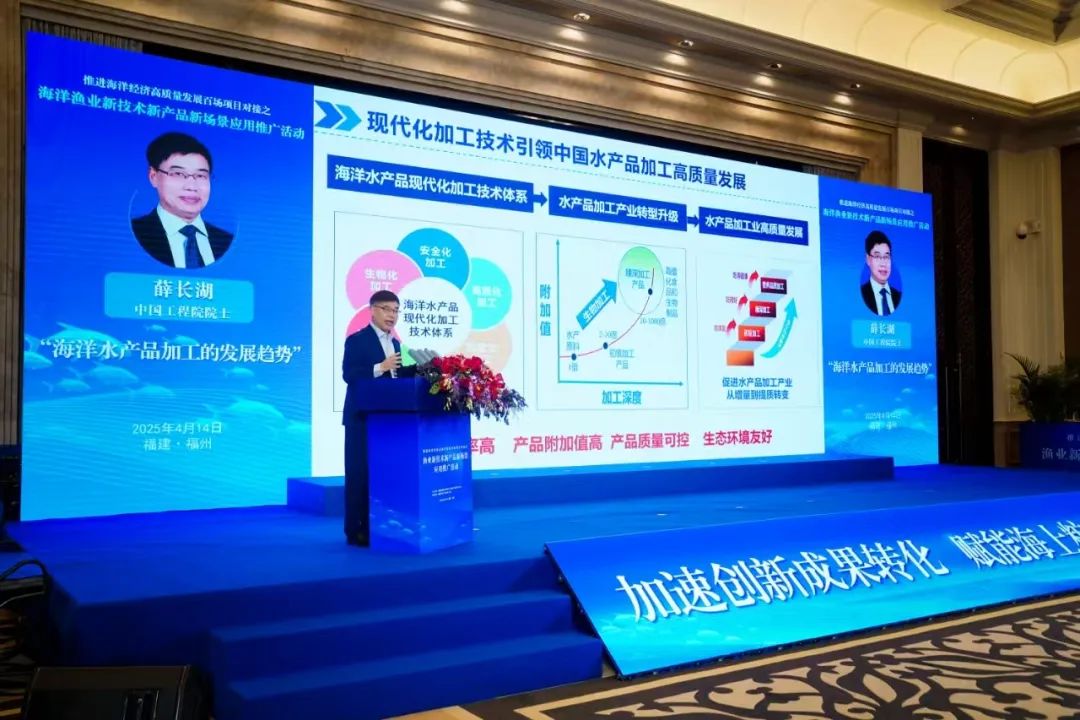 在主旨報(bào)告環(huán)節(jié),劉少軍以《魚類良種良養(yǎng)良銷》為題,聚焦魚類遺傳育種,分享了合方鯽等優(yōu)質(zhì)魚類育種成果,并強(qiáng)調(diào)生態(tài)養(yǎng)殖模式創(chuàng)新,提出通過“良種+良養(yǎng)+良銷”全鏈條創(chuàng)新提升漁業(yè)競(jìng)爭(zhēng)力。薛長(zhǎng)湖以《海洋水產(chǎn)品加工的發(fā)展趨勢(shì)》為題,分析了海洋食品加工的高值化、綠色化趨勢(shì),指出當(dāng)前水產(chǎn)品加工領(lǐng)域存在的品質(zhì)參差不齊、技術(shù)創(chuàng)新不足等問題,并分享了團(tuán)隊(duì)在生物加工、營(yíng)養(yǎng)功能化加工、冷凍保鮮技術(shù)等方面的創(chuàng)新成果。