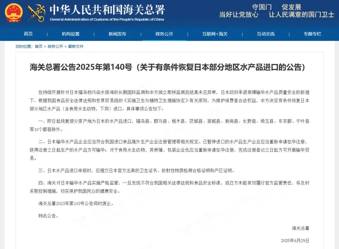 據(jù)海關(guān)總署消息,在持續(xù)開展針對(duì)日本福島核污染水排海的長期國際監(jiān)測和中方獨(dú)立取樣監(jiān)測且結(jié)果未見異常,日本政府承諾保障輸華水產(chǎn)品質(zhì)量安全的前提下,根據(jù)我國食品安全法律法規(guī)和世界貿(mào)易組織《實(shí)施衛(wèi)生與植物衛(wèi)生措施協(xié)定》有關(guān)原則,為維護(hù)消費(fèi)者合法權(quán)益,中方?jīng)Q定有條件恢復(fù)日本部分地區(qū)水產(chǎn)品(含食用水生動(dòng)物,下同)進(jìn)口。具體事項(xiàng)公告如下: