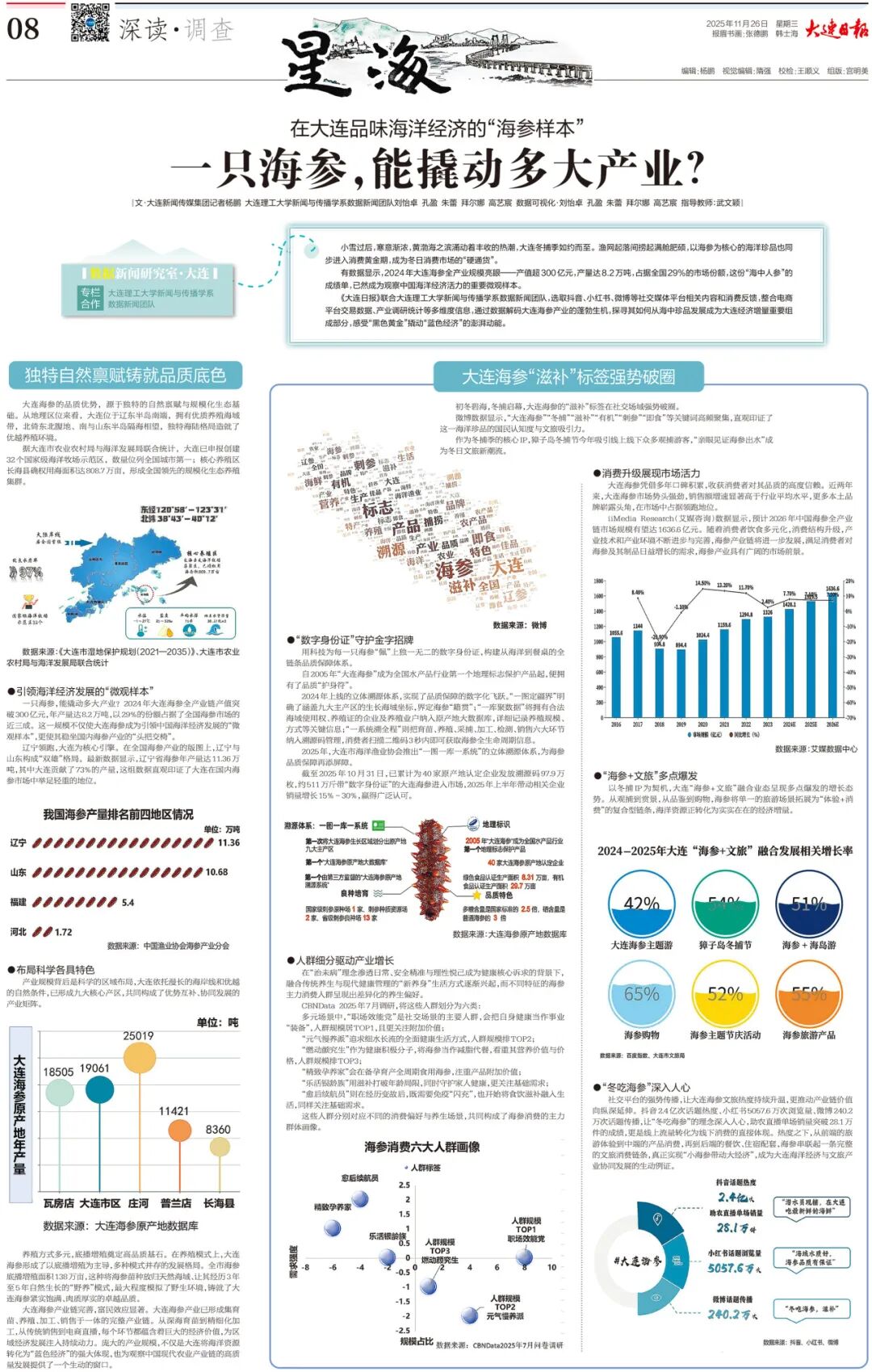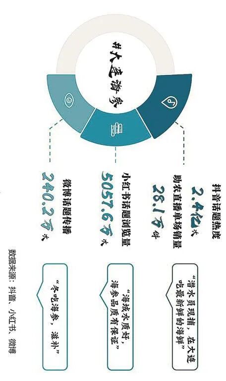 《大連日報》聯(lián)合大連理工大學(xué)新聞與傳播學(xué)系數(shù)據(jù)新聞團隊,選取抖音、小紅書、微博等社交媒體平臺相關(guān)內(nèi)容和消費反饋,整合電商平臺交易數(shù)據(jù)、產(chǎn)業(yè)調(diào)研統(tǒng)計等多維度信息,通過數(shù)據(jù)解碼大連海參產(chǎn)業(yè)的蓬勃生機,探尋其如何從海中珍品發(fā)展成為大連經(jīng)濟增量重要組成部分,感受“黑色黃金”撬動“藍色經(jīng)濟”的澎湃動能。